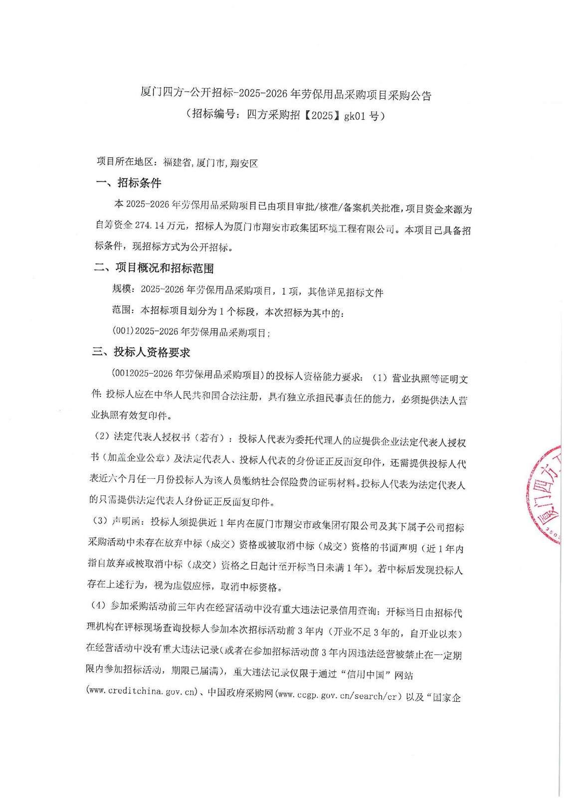 厦门四方-公开招标-2025-2026年劳保用品采购项目采购公告